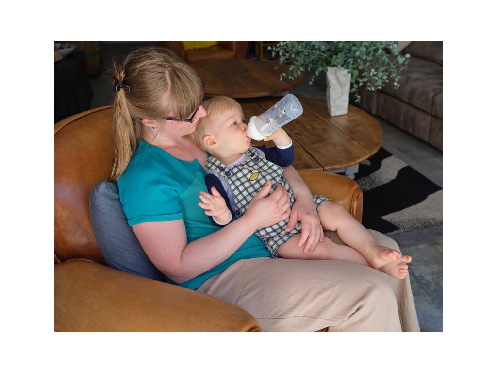 Ergonomický tvar fľaštičky padne rodičom aj deťom prirodzene do ruky, široké hrdlo uľahčuje plnenie aj čistenie a viečko chráni čistotu cumlíka počas prenášania.