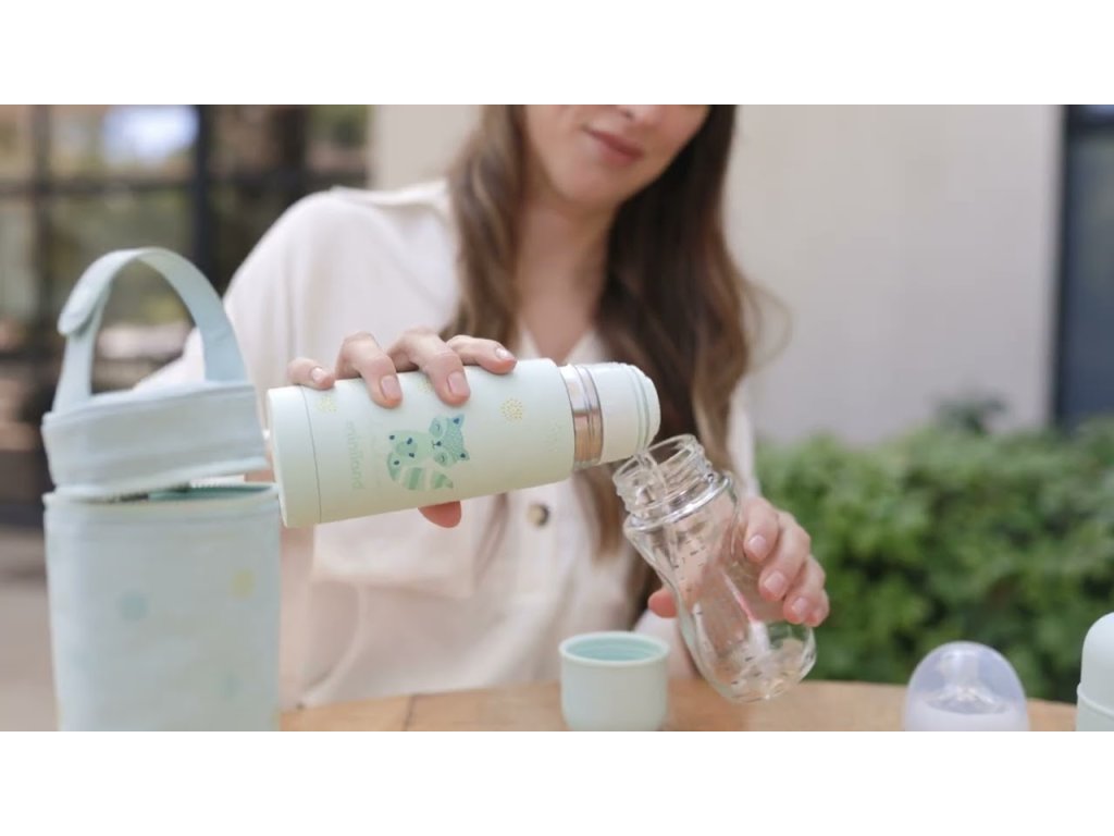 Termoska je potiahnutá jemným protišmykovým materiálom, ktorý sa príjemne drží, a jej elegantný pastelový vzhľad perfektne zapadne k ostatným produktom značky Miniland.
