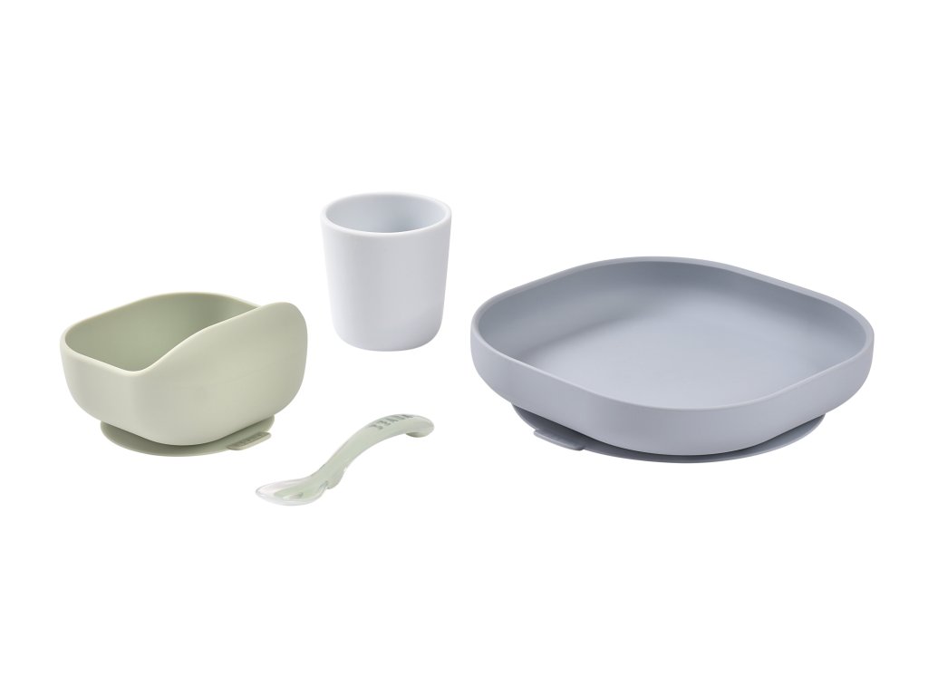 Sada obsahuje tanier, misku, téglik na pitie a lyžičku z vysoko kvalitného silikónu, ideálne pre prvé samostatné stolovanie.