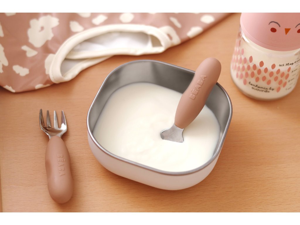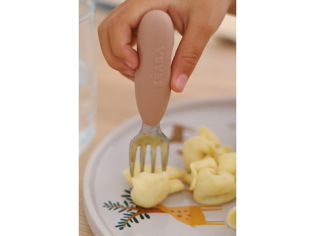 Prvý príbor Beaba Praline z nerezu s ergonomickými rúčkami pomáha deťom od 10 mesiacov učiť sa samostatne jesť bezpečne a jednoducho.